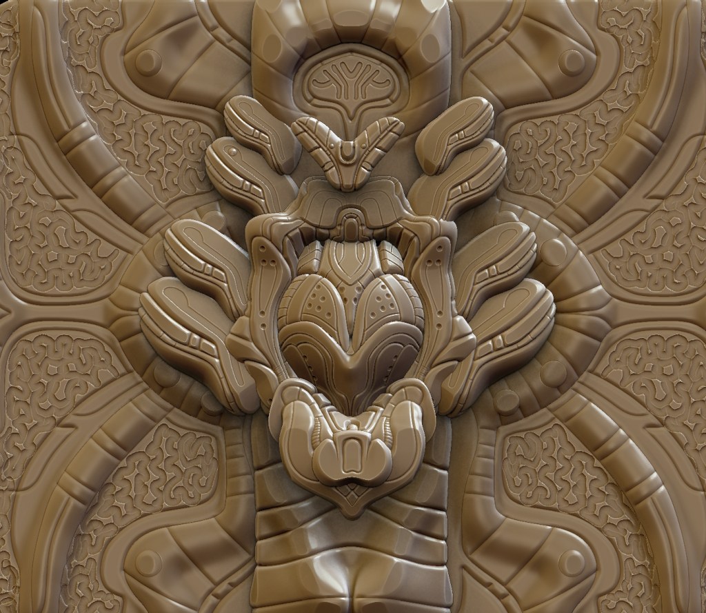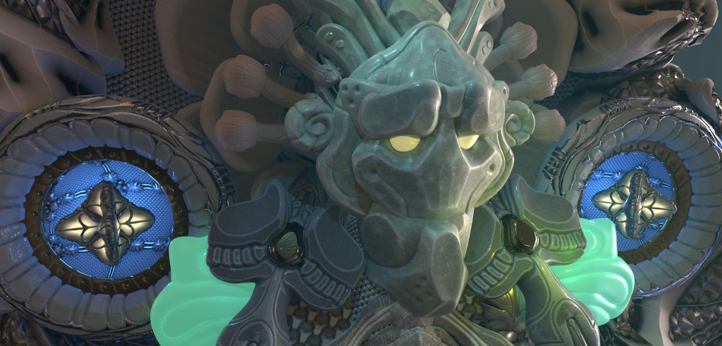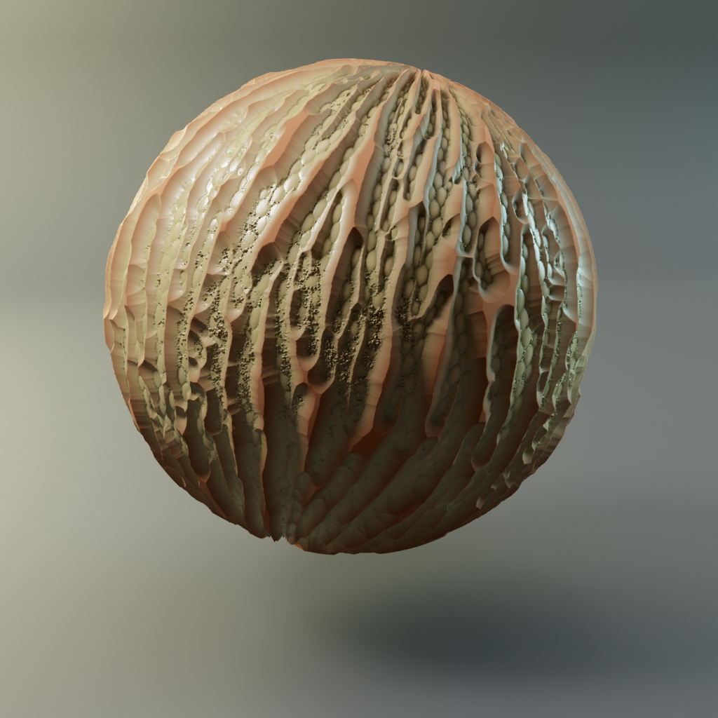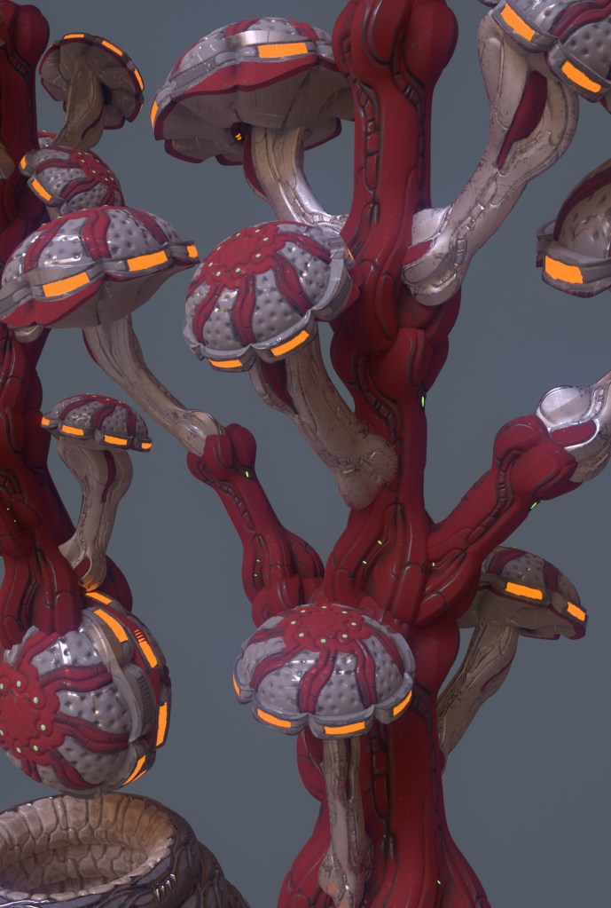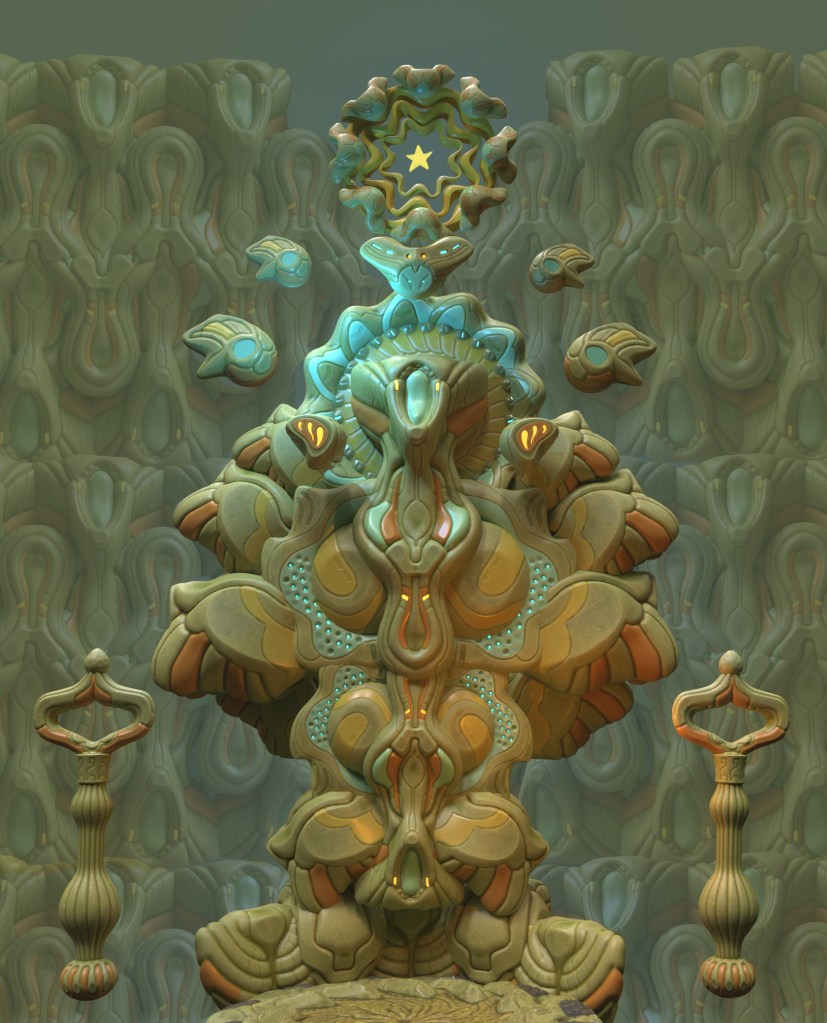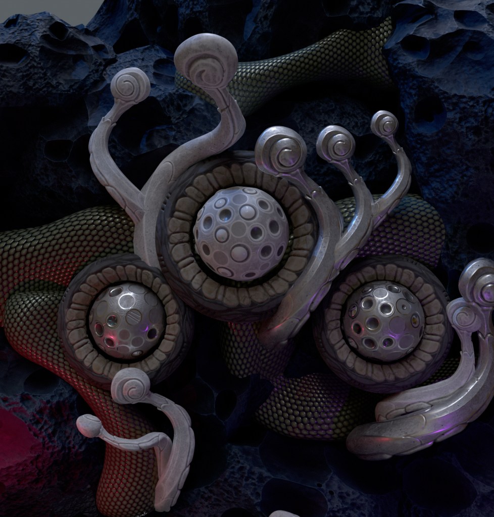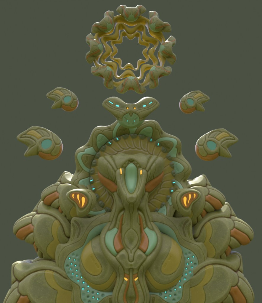 Below is the initial zbrush sculpt. When I start these illustrations, I just start sculpting forms and shapes, sometimes I have a theme in mind, but mostly I just jump in sculpting. I try to come up with a shape language to tie the forms together and play with compositions. I can sculpt much faster than I can sketch so it allows me to experiment and play at a quick rate, letting creativity come through without the hindrance of tools. I’ve been working with zbrush for many years in the game industry, so I’m quite comfortable iterating quickly. Once I’m done with the sculpt, I have to prep the model to be utilized in “Substance painter” where Ill start creating materials.